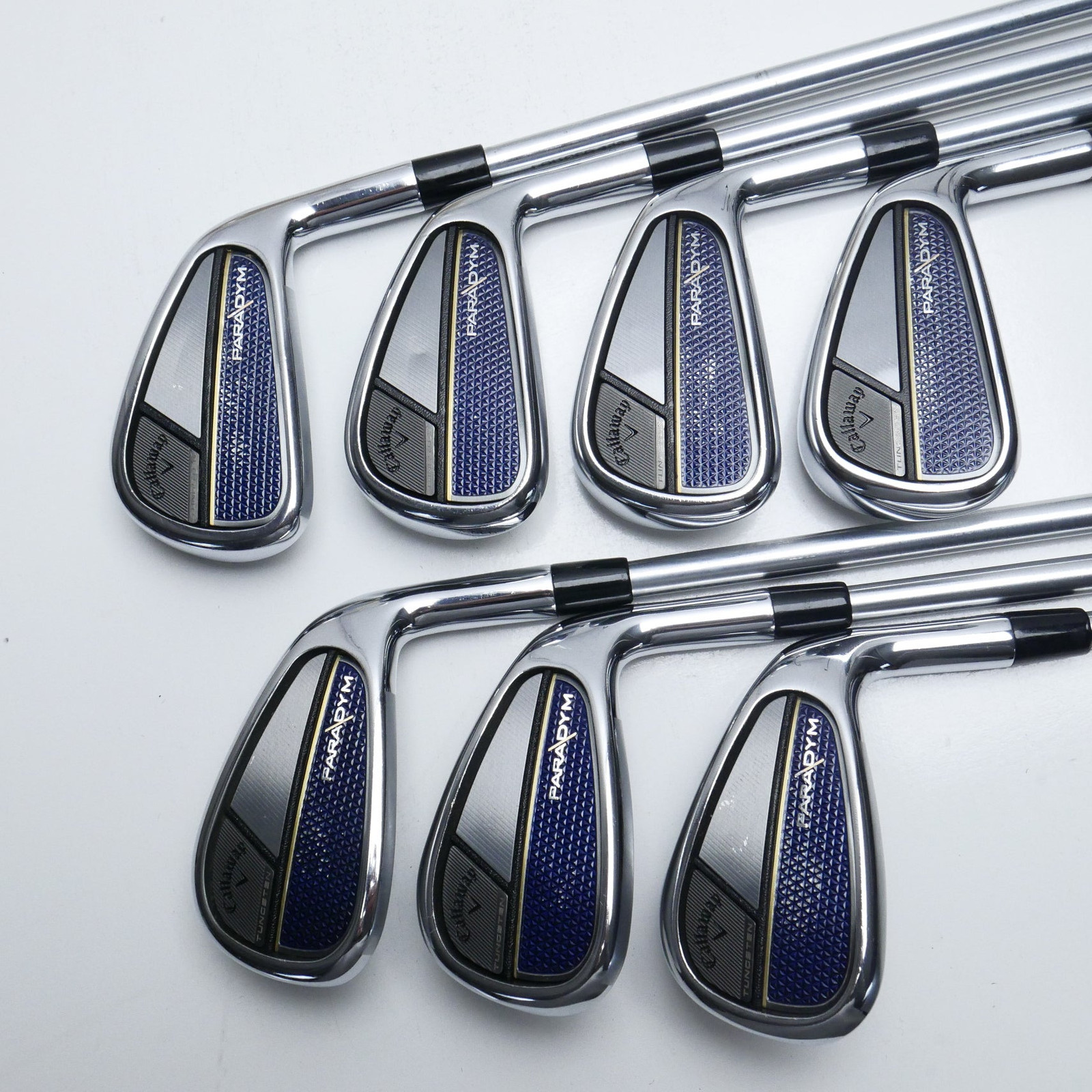 The Used Callaway Paradym Iron Set is designed for golfers seeking maximum forgiveness, distance, and playability. Featuring hollow-body construction with urethane microspheres, the Paradym irons provide a soft, responsive feel while optimizing ball speed and distance. The tungsten weighting and perimeter design ensure a higher launch, improved stability, and straighter shots on off-center strikes. With a sleek, modern profile and clean topline, these irons inspire confidence at address, making them ideal for mid-to-high handicap players who want consistent performance across the set.